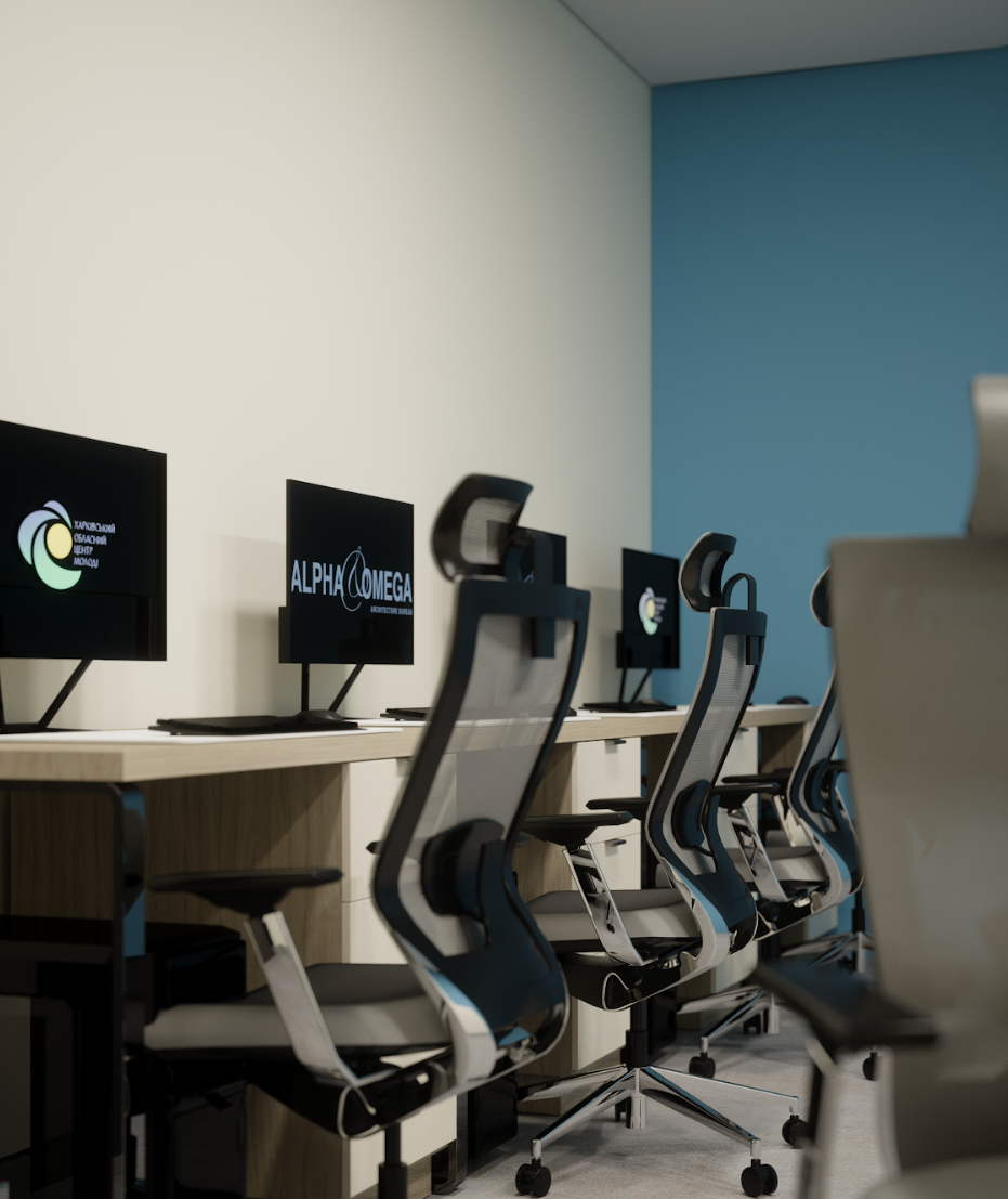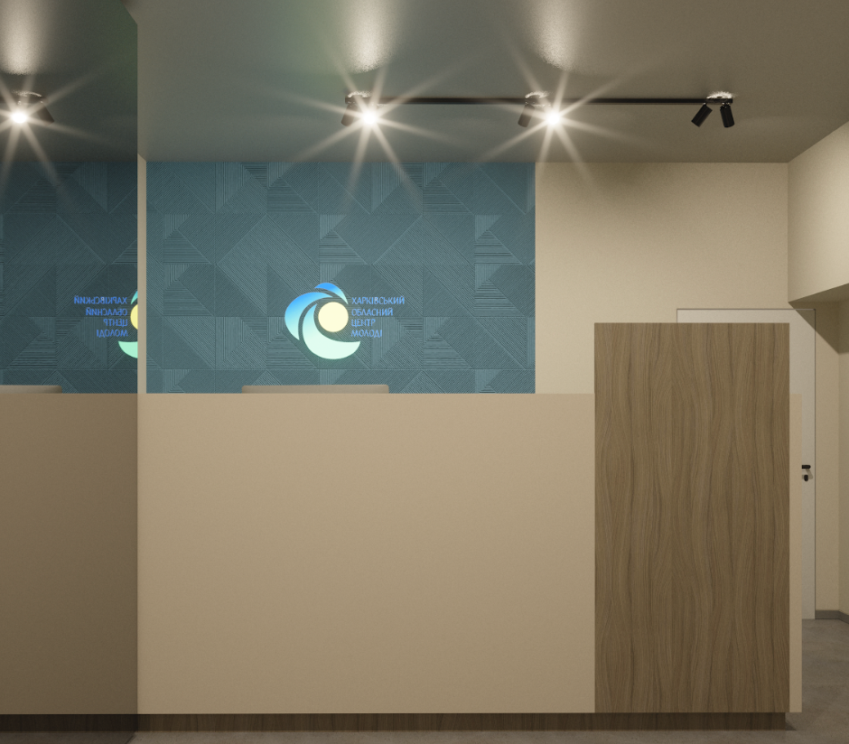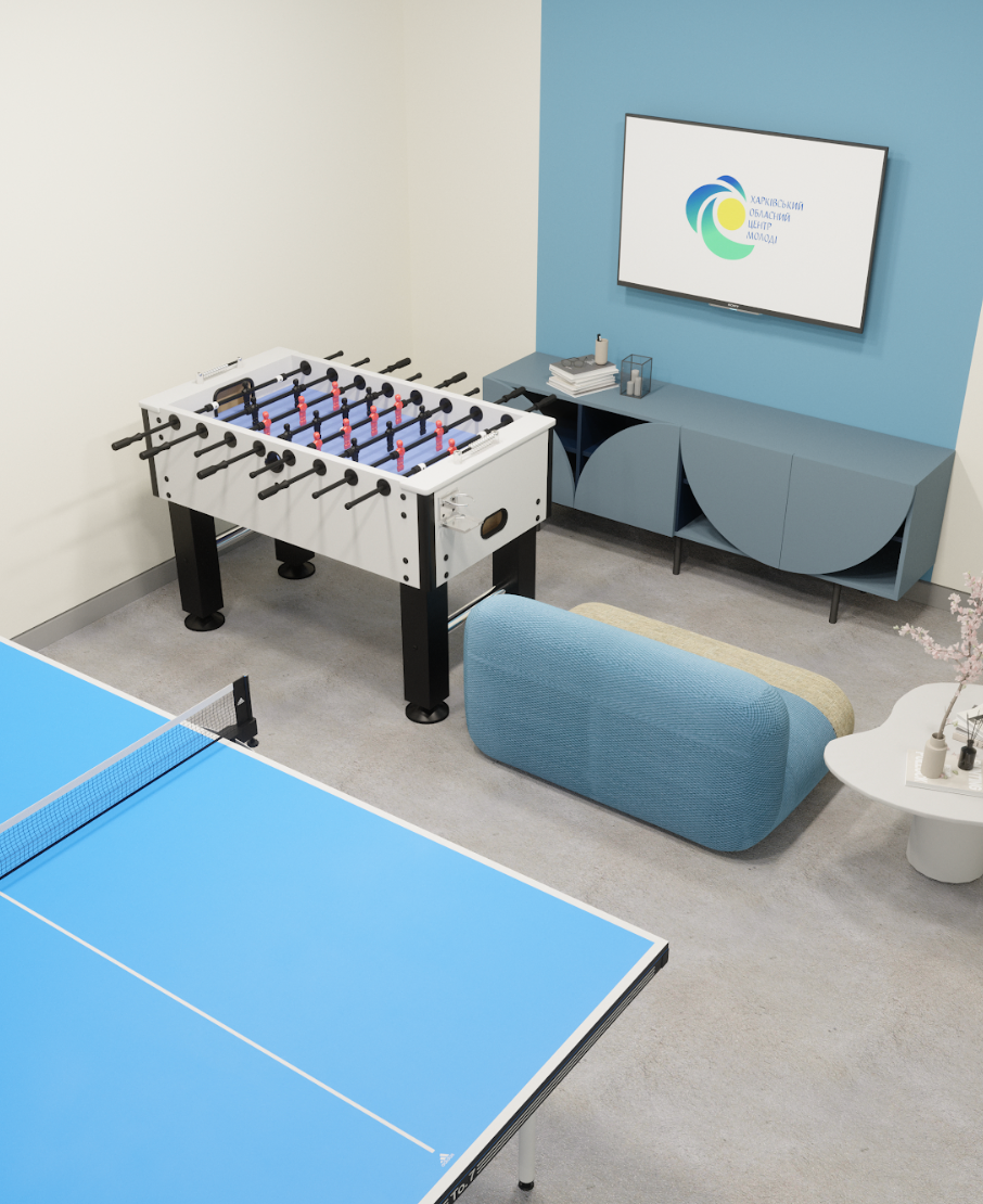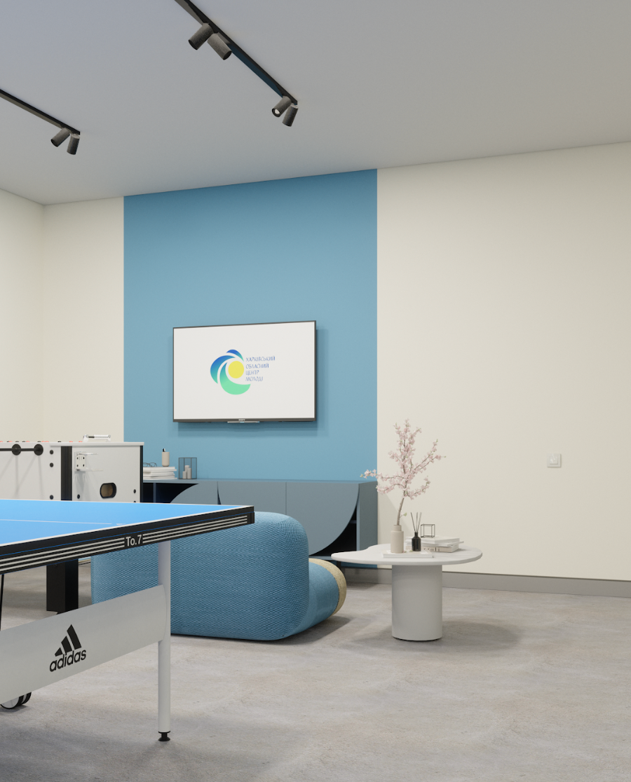 The design blends vibrant accent colors, warm lighting, and tactile materials, fostering an engaging and inspiring atmosphere for youth-driven initiatives.