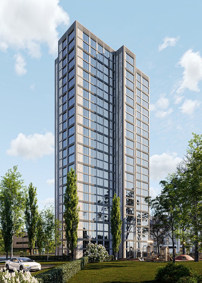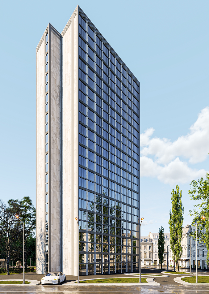 This project involves the design of a residential high-rise building in Kyiv, Ukraine, featuring a modern facade with clean lines, large glass windows, and a blend of stone and metal materials. The building is designed to offer functional urban living with spacious, light-filled apartments. The design takes into account the surrounding architecture, seamlessly integrating with its environment. The surrounding area includes green spaces, pedestrian walkways, and easy access to transportation, ensuring comfort and convenience for residents.